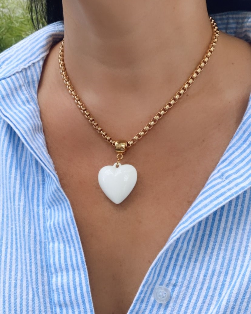 Colar com pingente coração e corrente elos pequenos. O pingente no formato coração é esmaltado na cor branca